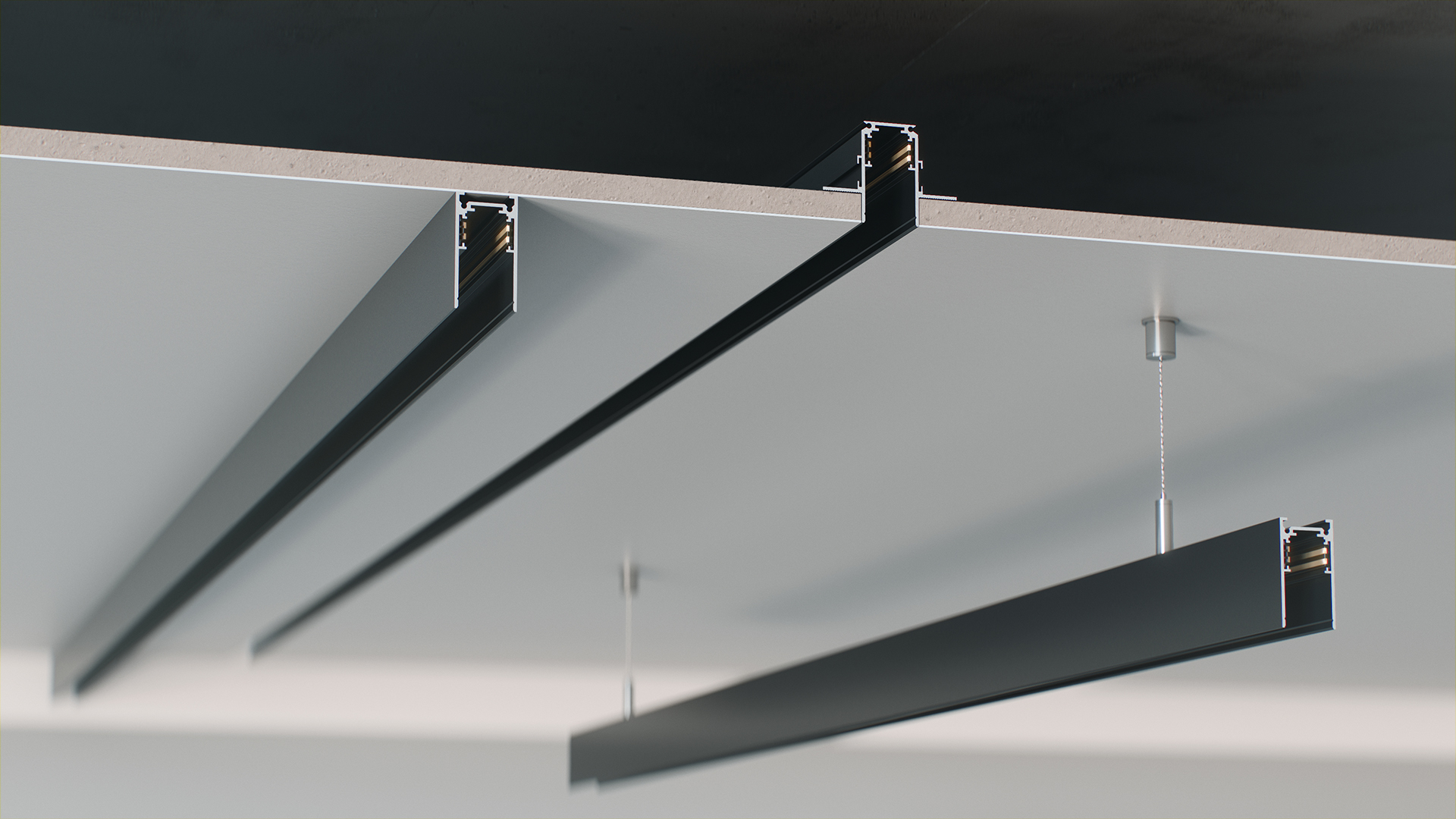 Montaż podwieszany wymaga użycia szynoprzewodu magnetycznego GENESIS w wersji nawierzchniowej oraz kompletu zawiesi, montowanych w kanale montażowym wbudowanym w szynoprzewód.