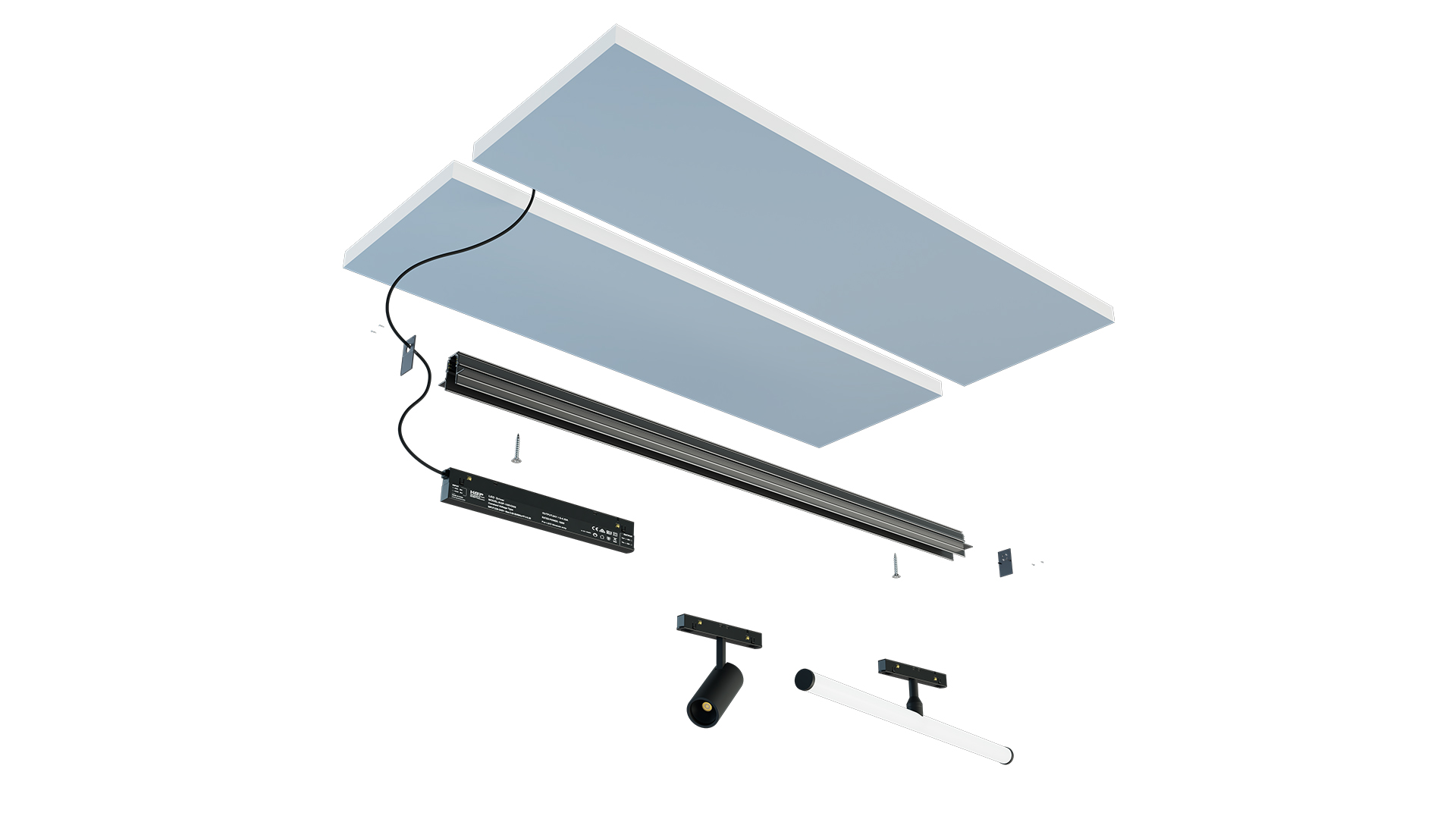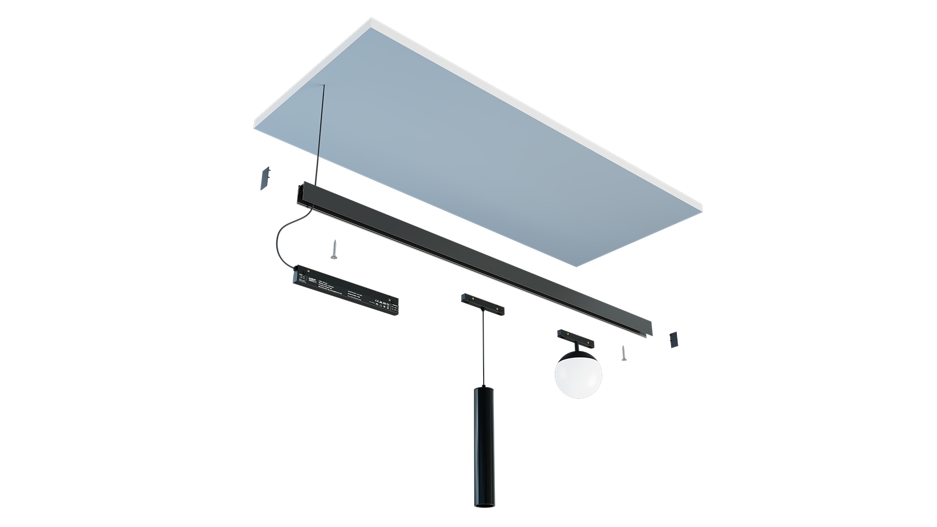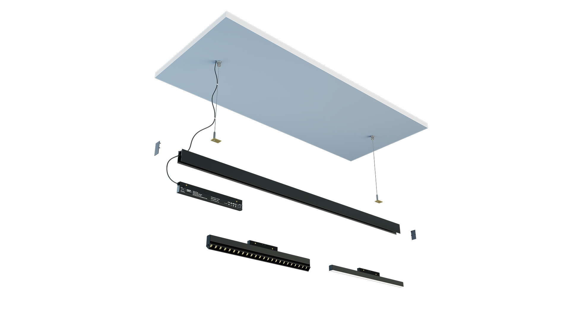 Montaż podwieszany wymaga użycia szynoprzewodu magnetycznego GENESIS w wersji nawierzchniowej oraz kompletu zawiesi, montowanych w kanale montażowym wbudowanym w szynoprzewód.