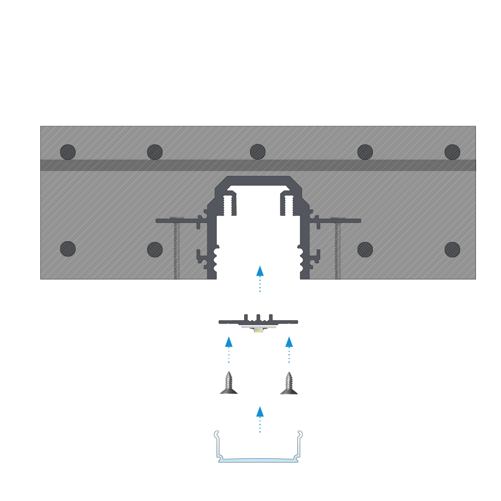 Instrukcja montażu profilu montażowego DURO M1 z kloszem LIFT ONE przy użyciu wkrętów.