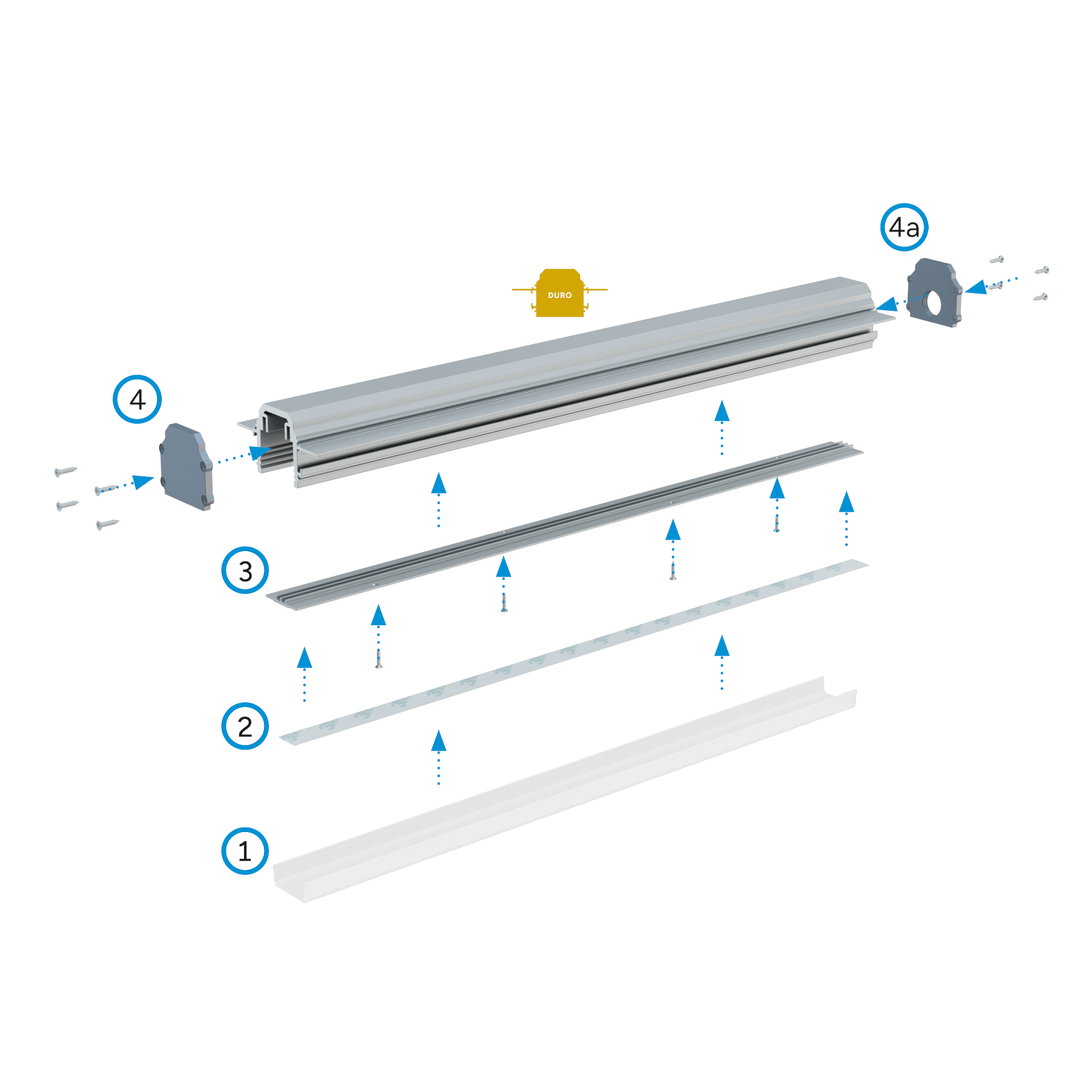 Schemat złożenia elementów systemu oświetleniowego z wykorzystaniem profilu DURO oraz (1) klosza LIFT ONE, (2) taśmy LED, (3) profilu montażowego DURO M1, (4) zaślepki DURO bez otworu, (4a) zaślepki DURO z otworem.