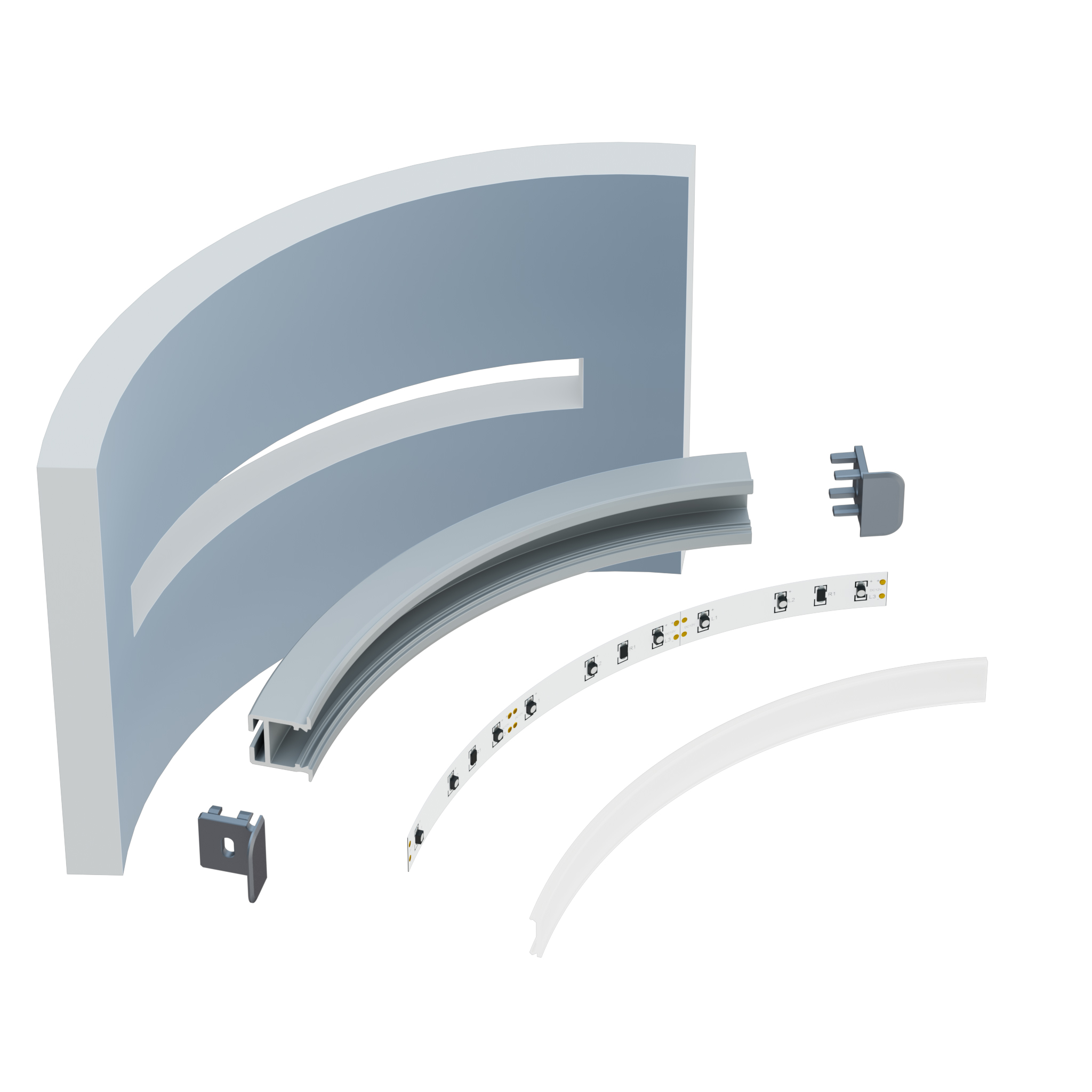 Schemat złożenia elementów systemu oświetleniowego z wykorzystaniem profilu inFLEXA wygiętego wertykalnie (kierunek światła: do wewnątrz), klosza BASIC, taśmy LED oraz zaślepek