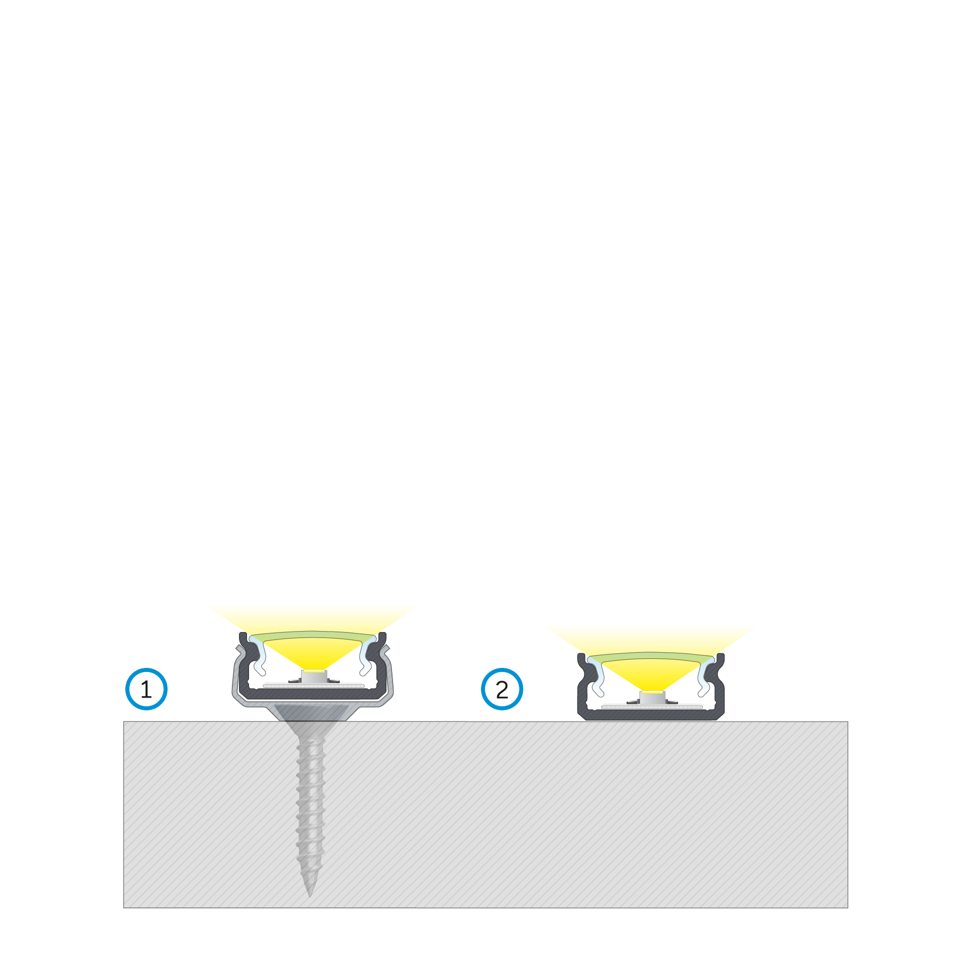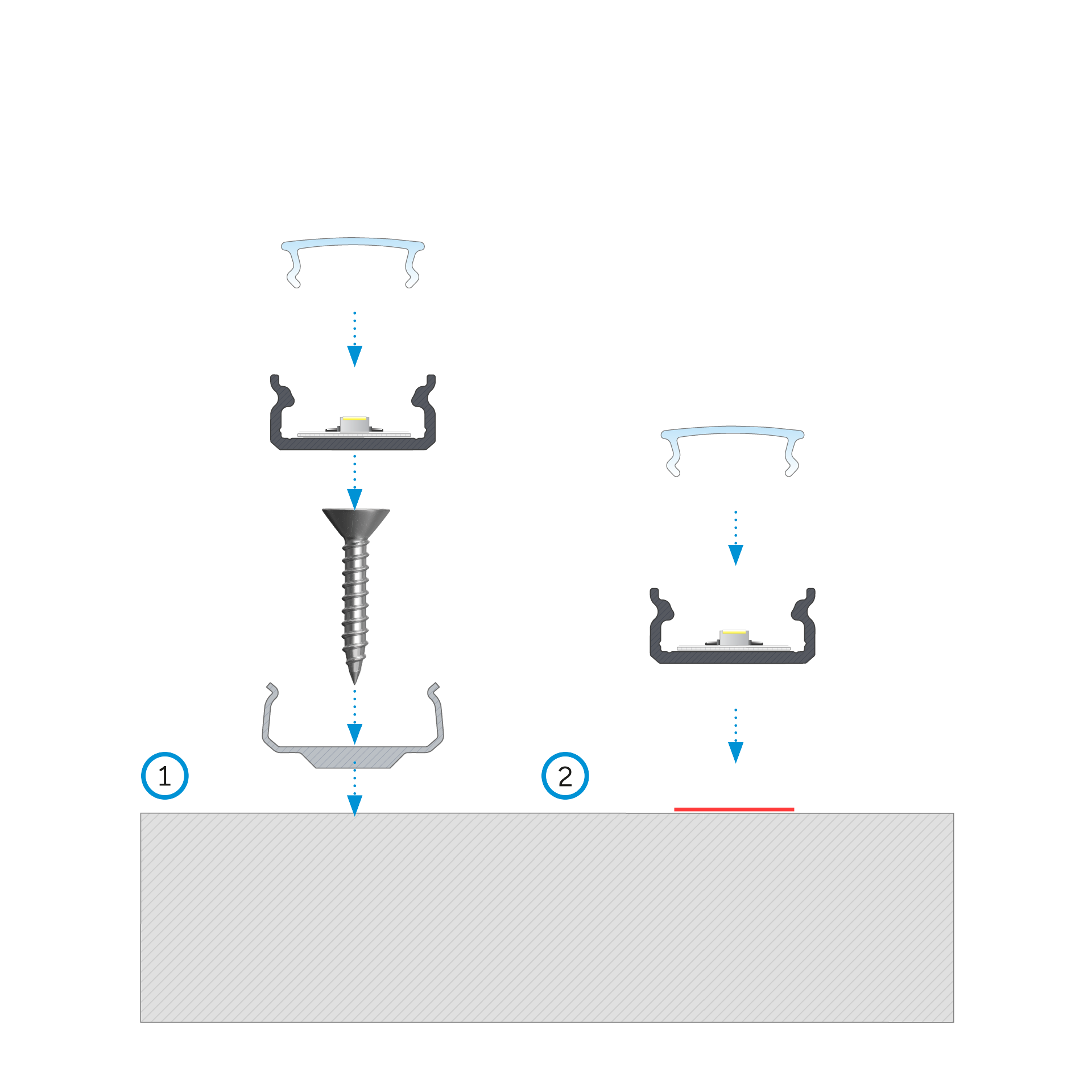 Instrukcja montażu profilu ONI z kloszem LEAN za pomocą (1) uchwytu montażowego, (2) taśmy dwustronnej.