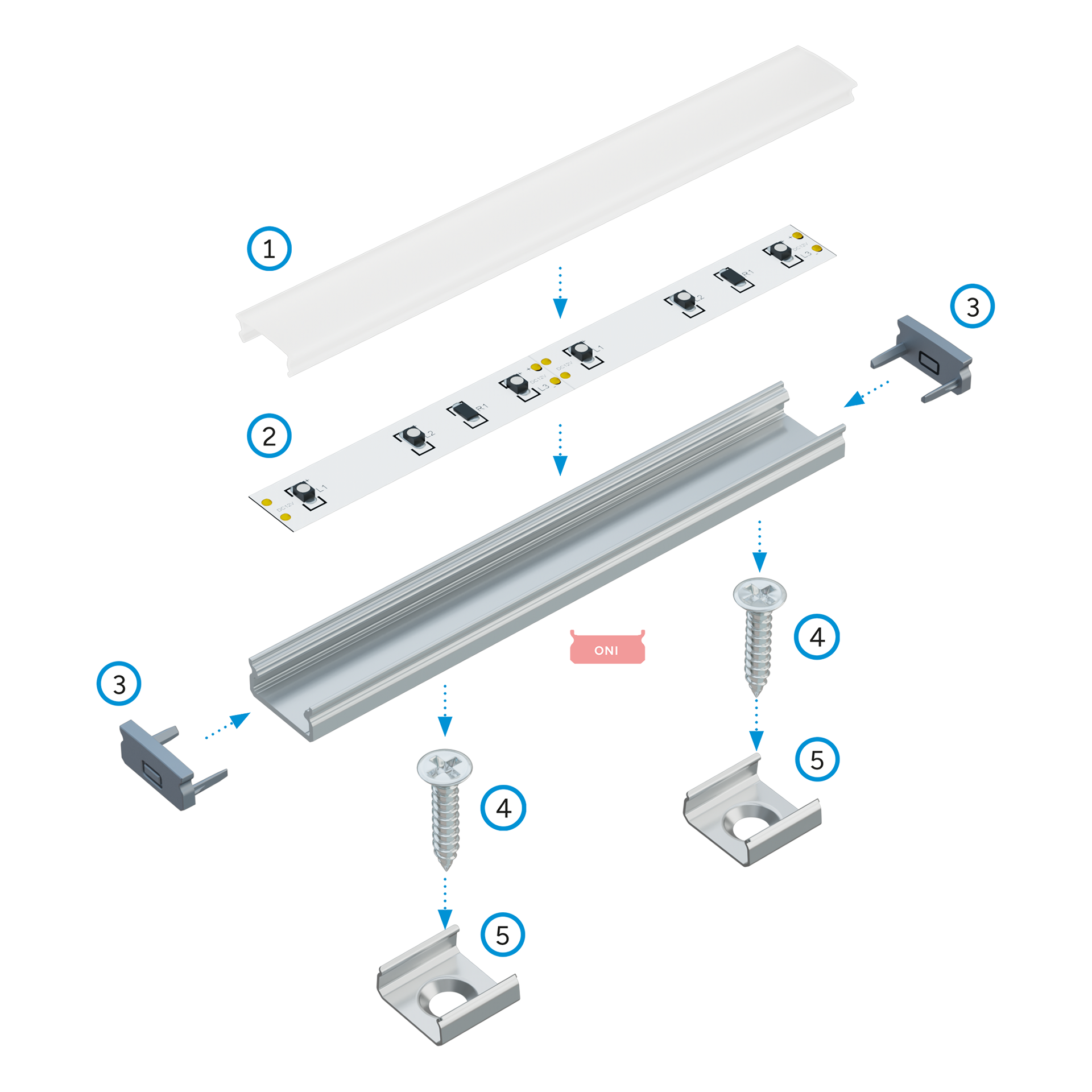 Schemat złożenia elementów systemu oświetleniowego z wykorzystaniem profilu ONI oraz (1) klosza LEAN, (2) taśmy LED, (3) zaślepek, (4) wkrętów, (5) uchwytów montażowych.