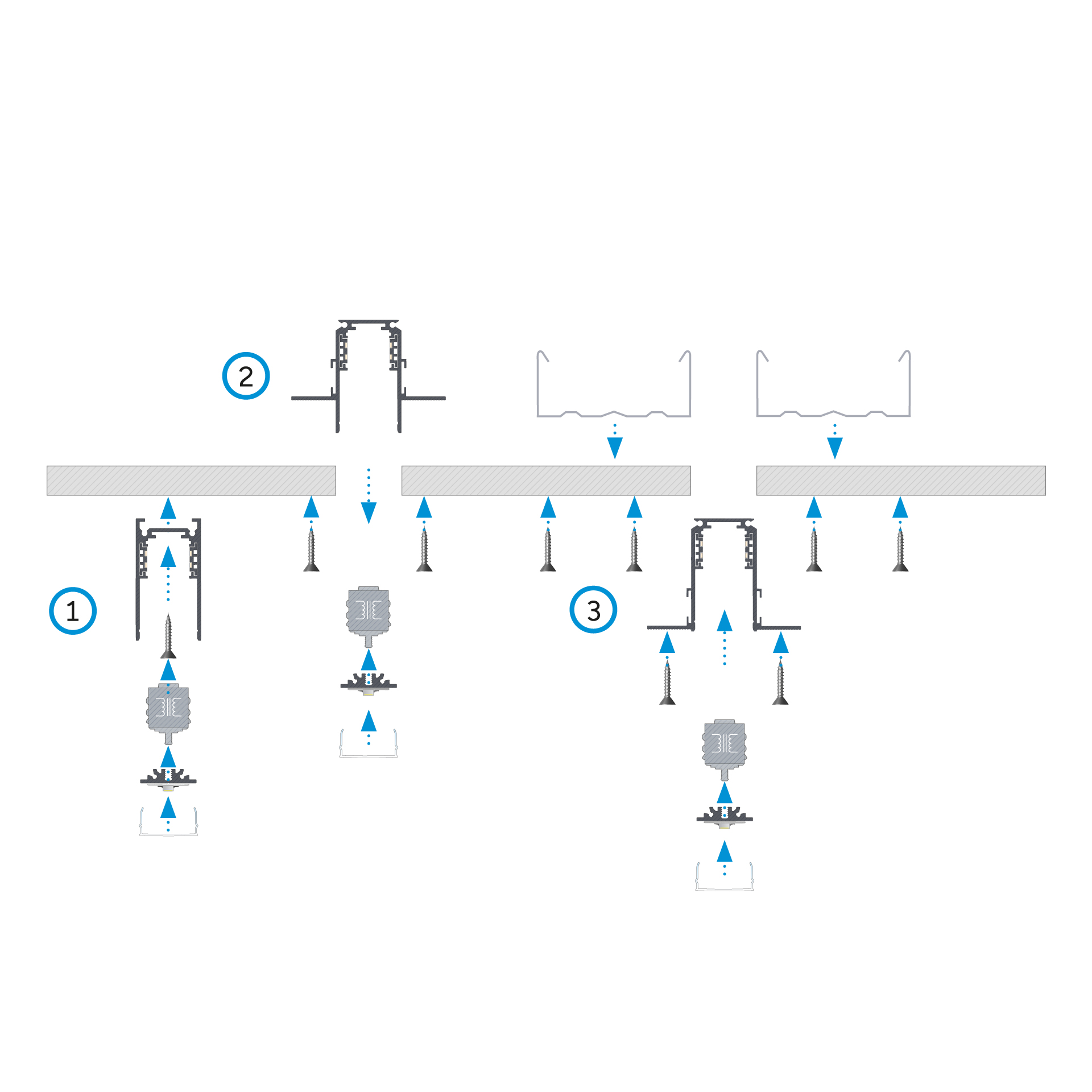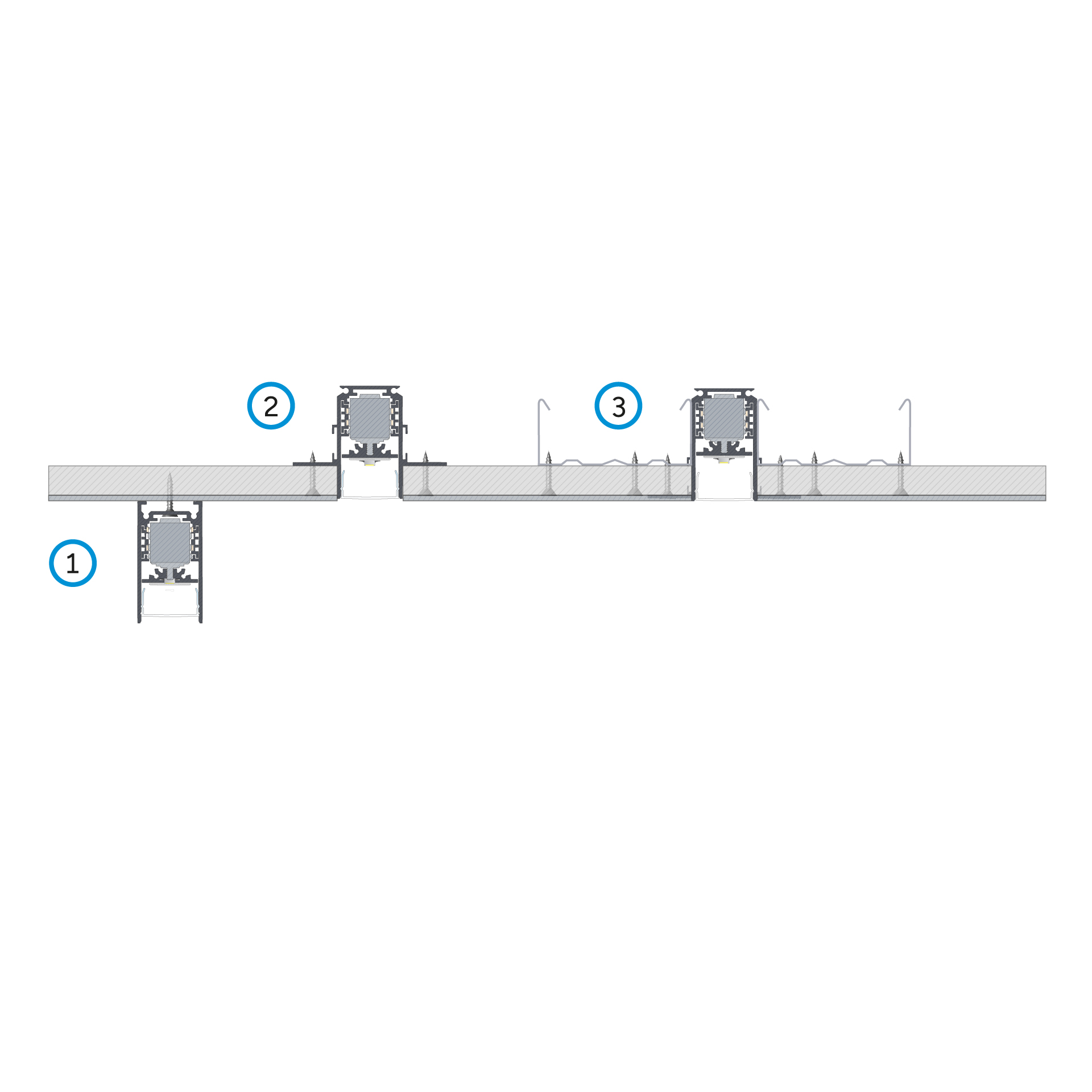 Efekt montażu profili LED SOLVIA z adapterami 48 V do magnetycznych szynoprzewodów GENESIS oraz kloszy GLIDE z wykorzystaniem: (1) szynoprzewodu magnetycznego GENESIS natynkowego i wkręta, (2) szynoprzewodu magnetycznego GENESIS podtynkowego T1 i wkrętów, (3) szynoprzewodu magnetycznego GENESIS bezramkowego T2, wkrętów oraz profili sufitowych