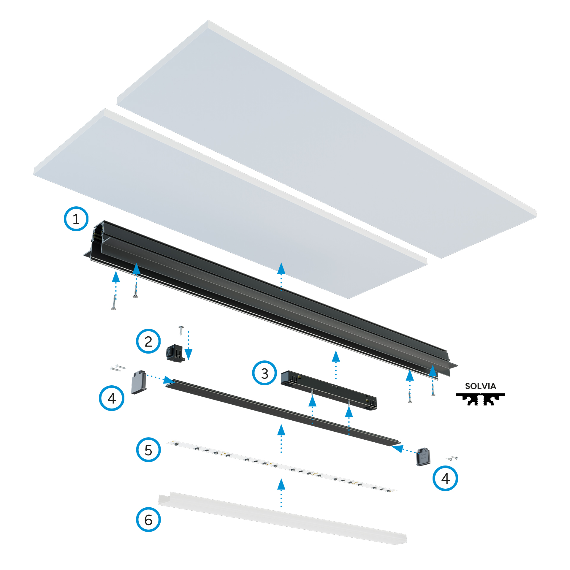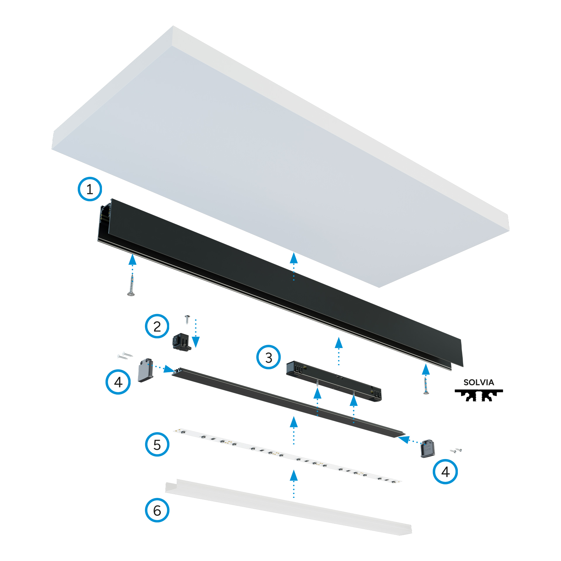 Schemat montażu elementów systemu oświetleniowego GENESIS z wykorzystaniem profilu LED SOLVIA oraz: (1) szynoprzewodu magnetycznego GENESIS natynkowego, (2) adaptera bezpieczeństwa, (3) adaptera 48 V, (4) zaślepek bez otworów, (5) taśmy LED, (6) klosza GLIDE.