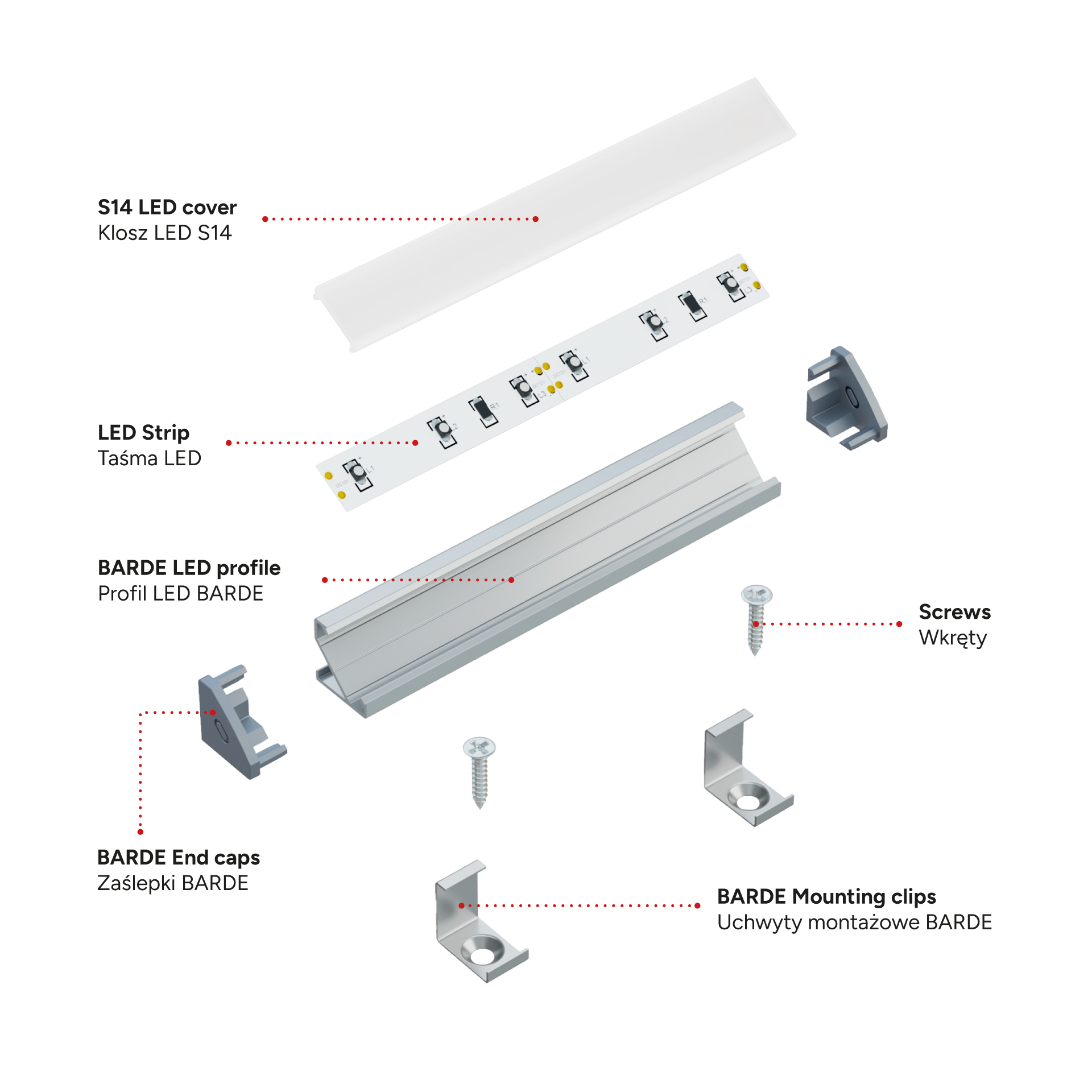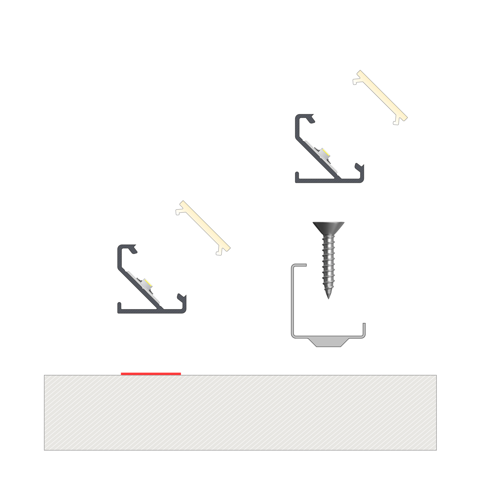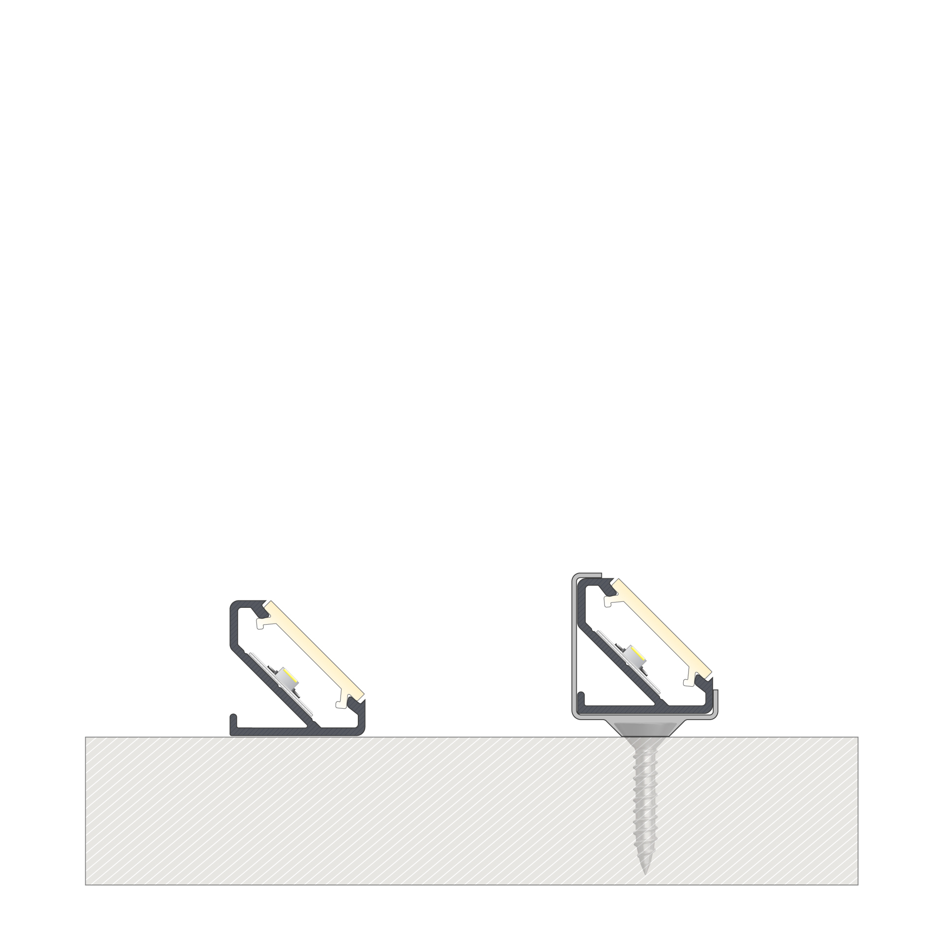 Profil LED kątowy 45° do zastosowań w kuchniach i strefach ekspozycyjnych. Stosowany do oświetlania szaf, blatów i innych powierzchni roboczych.