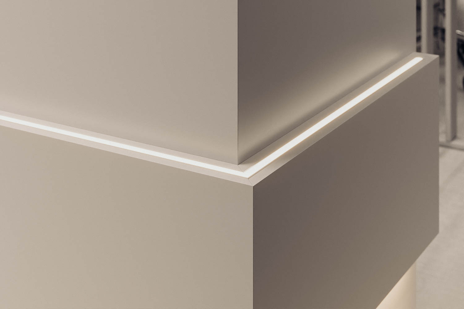 Profil LED wpuszczany do zastosowań w kuchniach i strefach ekspozycyjnych. Stosowany do oświetlania szaf, blatów i innych powierzchni roboczych.
