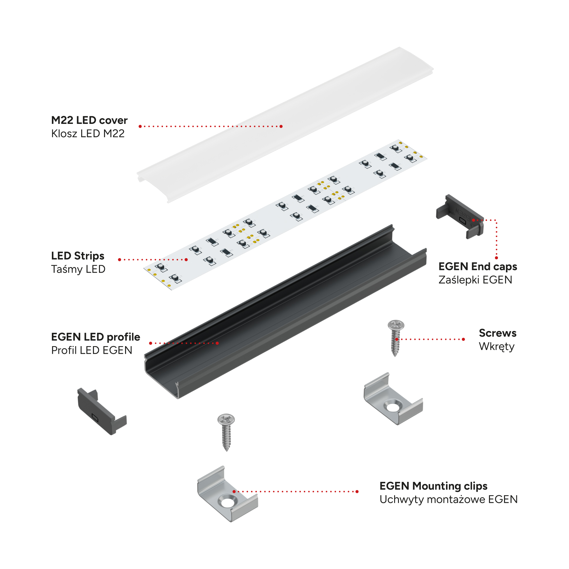 Zestaw zawiera: 1 x Profil LED EGEN, 1 x Klosz LED M22, 4 x Zaślepka EGEN, 4 x Uchwyt montażowy EGEN