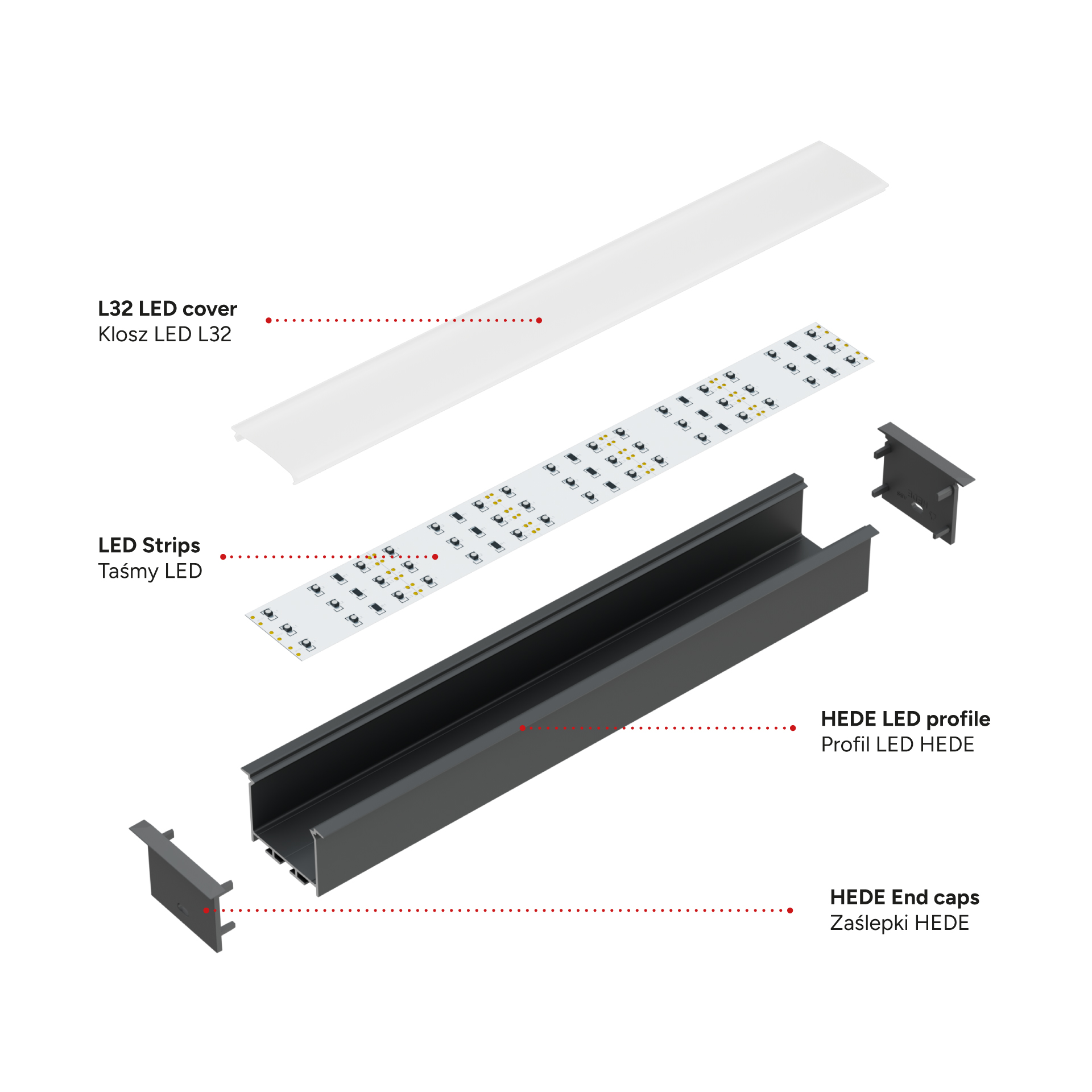 Zestaw zawiera: 1 x Profil LED HEDE, 1 x Klosz LED L32, 4 x Zaślepka HEDE