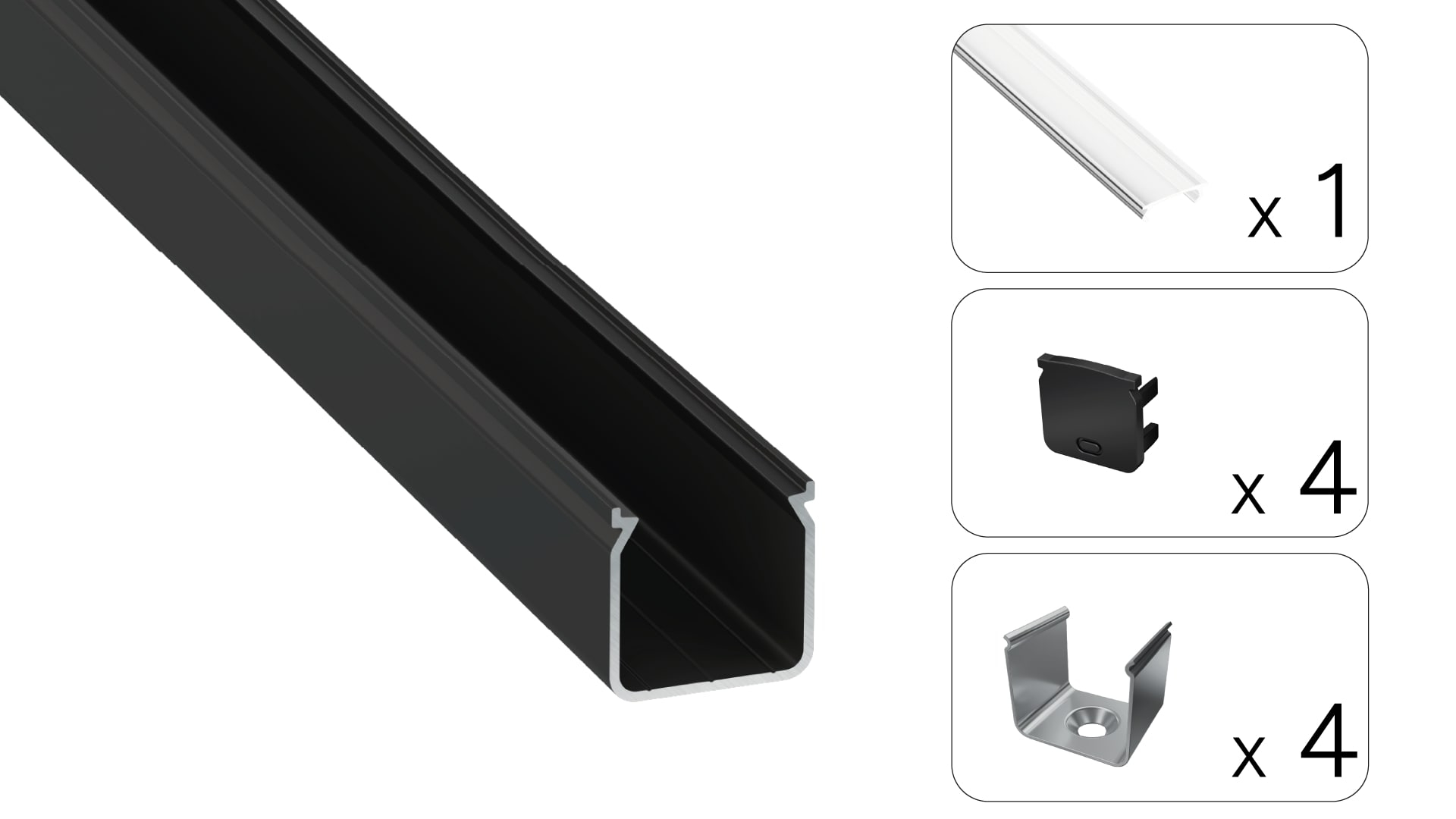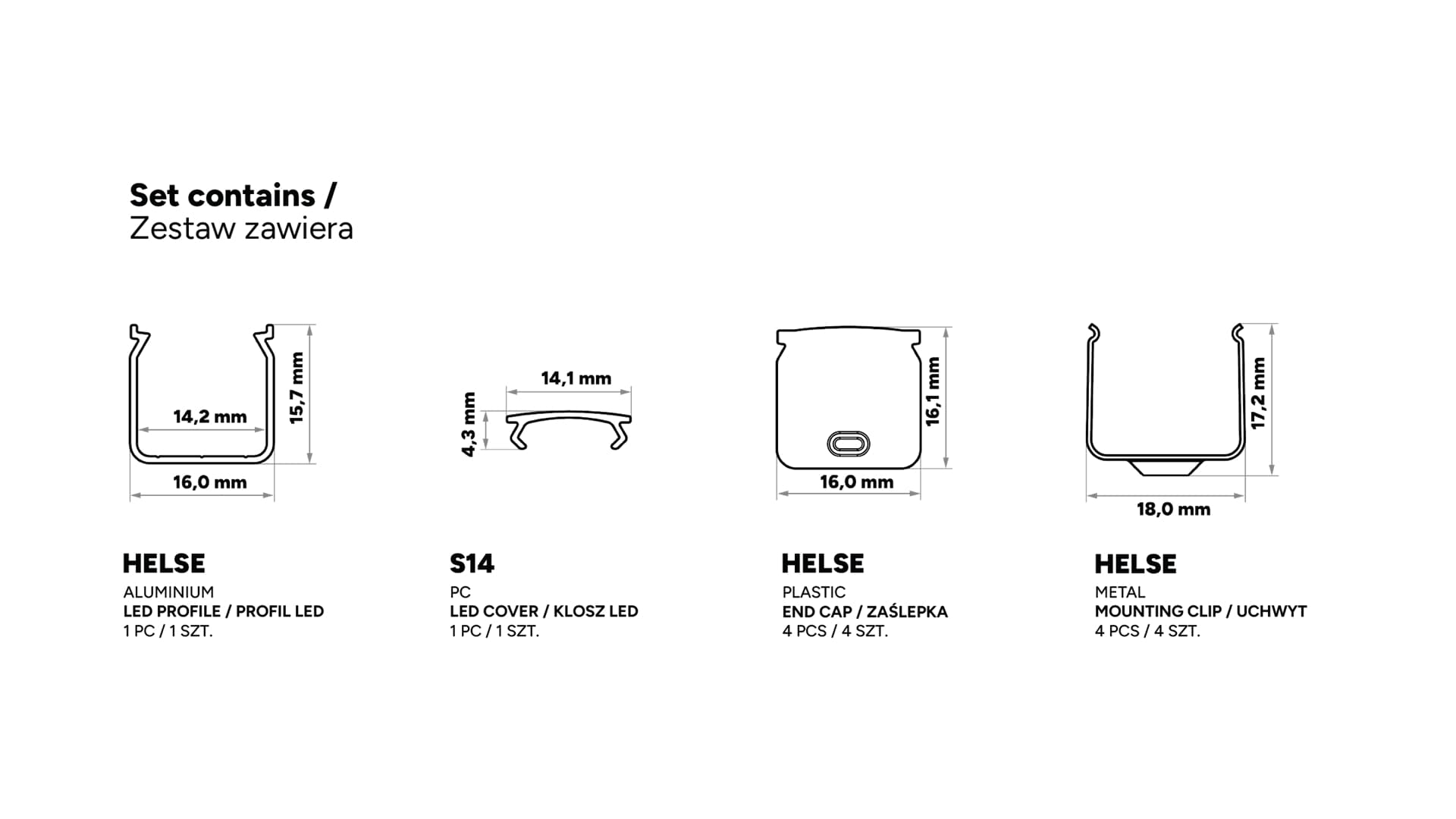 Zestaw zawiera: 1 x Profil LED HELSE, 1 x Klosz LED S14, 4 x Zaślepka HELSE, 4 x Uchwyt montażowy HELSE