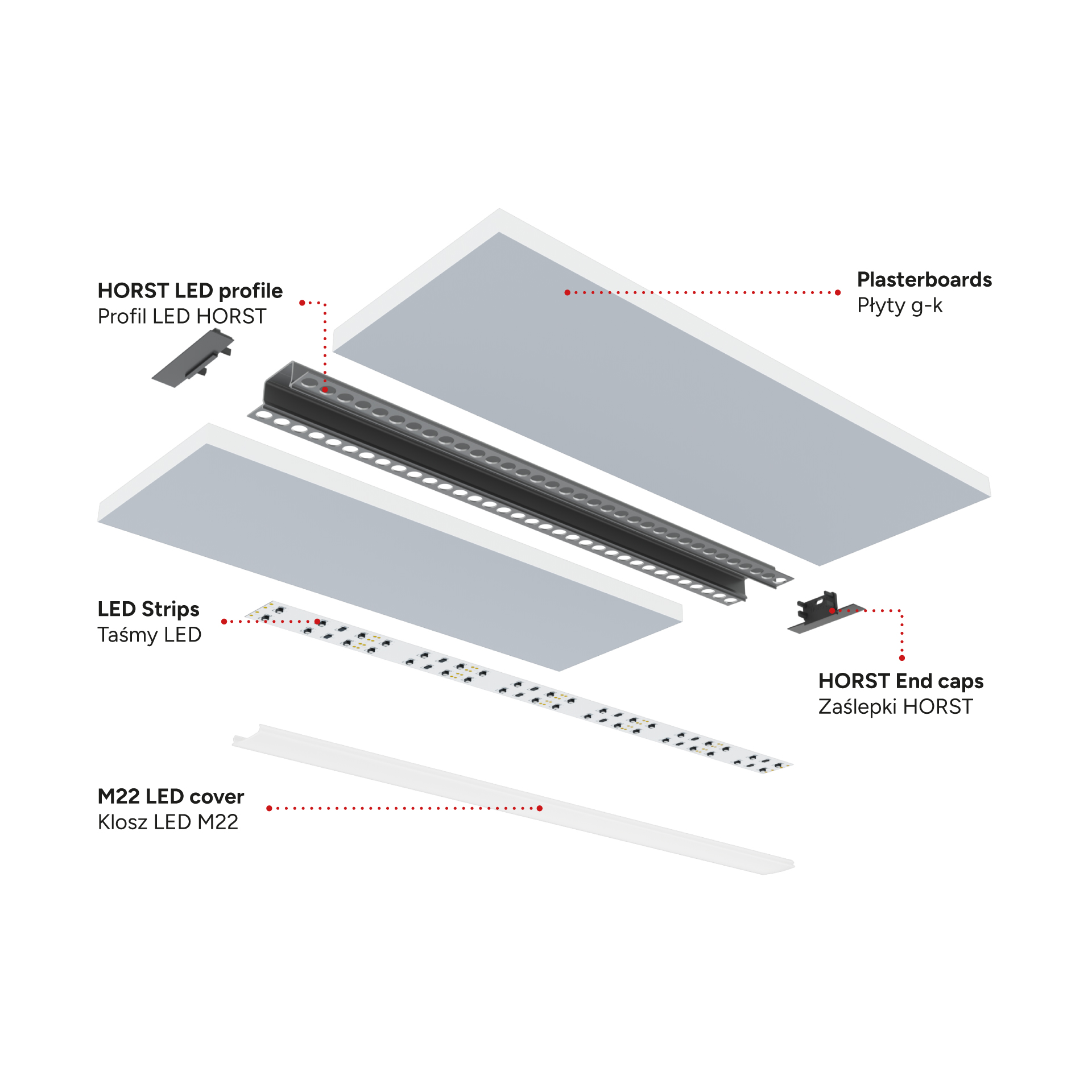 Zestaw zawiera: 1 x Profil LED HORST, 1 x Klosz LED M22, 4 x Zaślepka HORST
