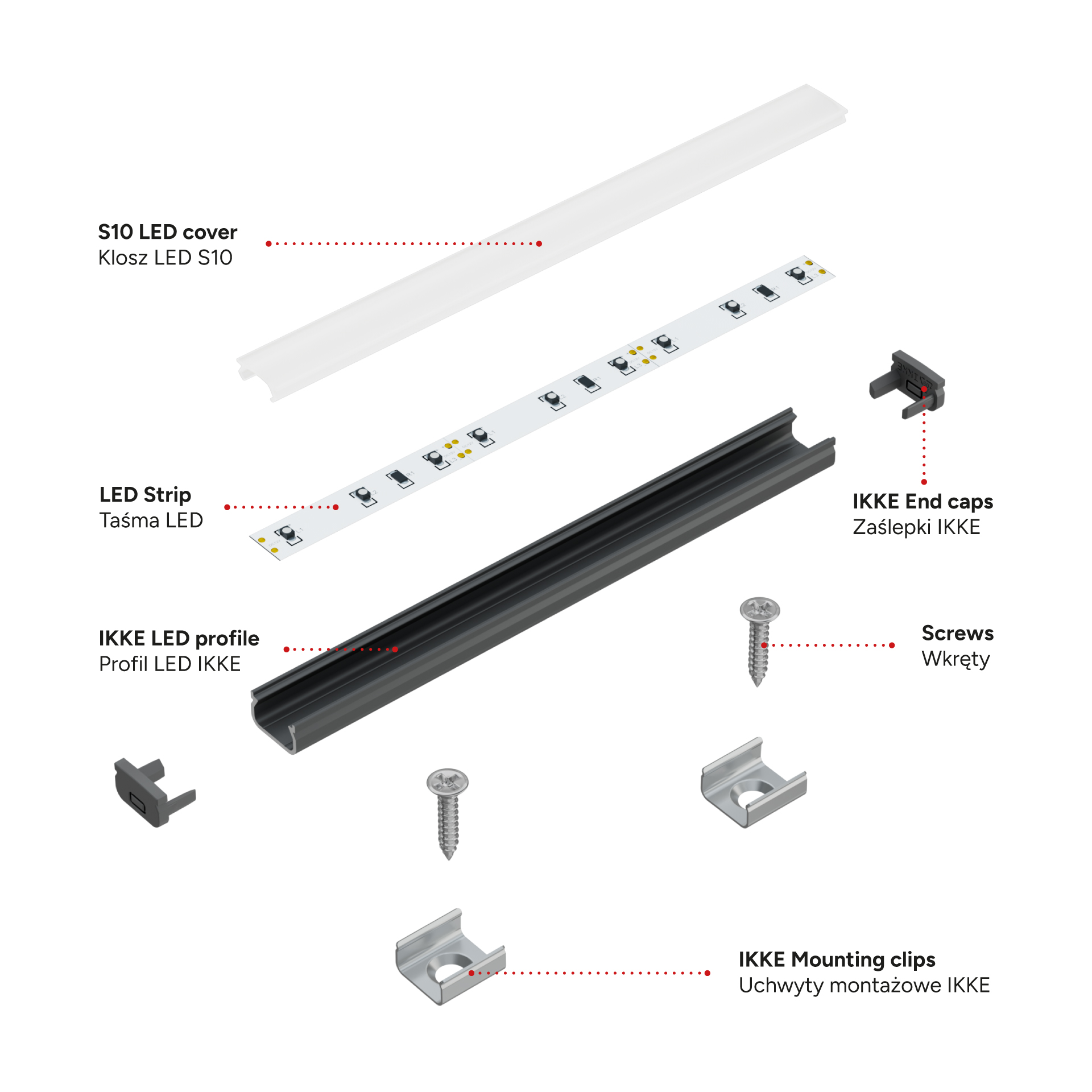 Zestaw zawiera: 1 x Profil LED IKKE, 1 x Klosz LED S10, 4 x Zaślepka IKKE, 4 x Uchwyt montażowy IKKE