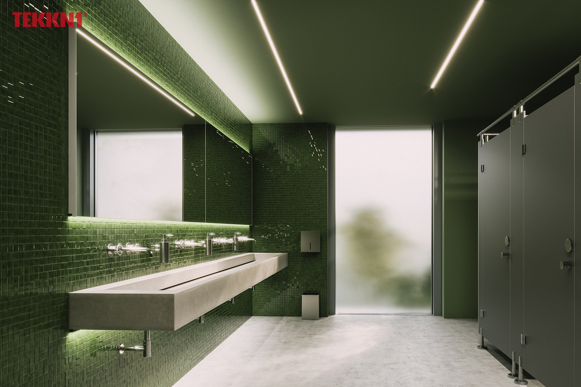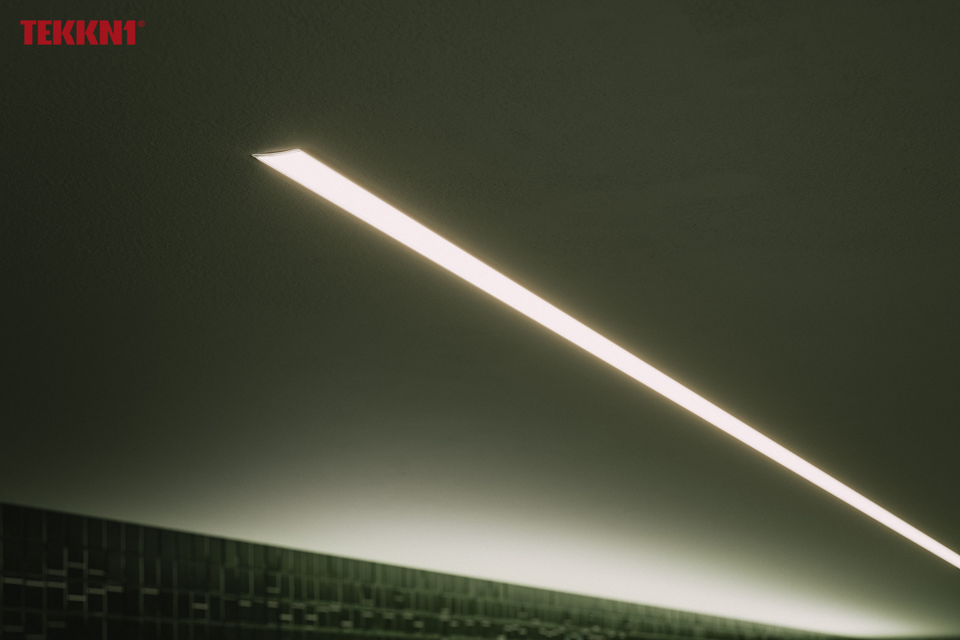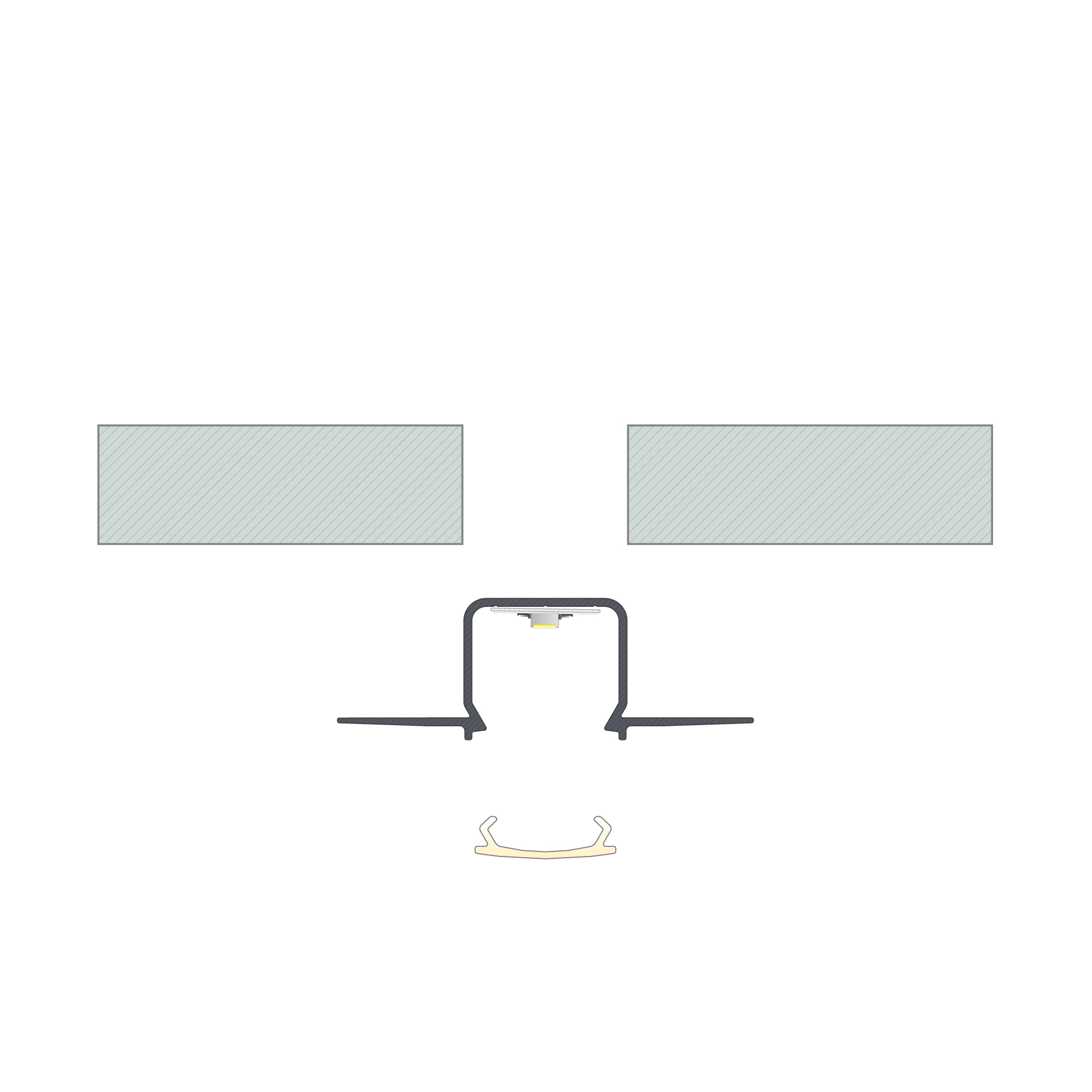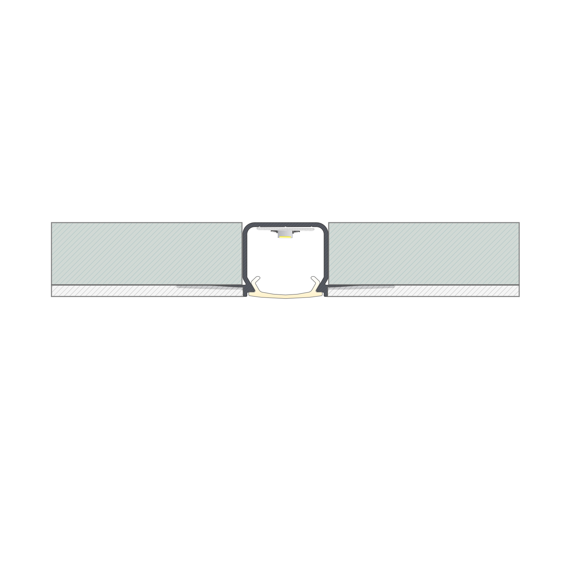 Jednotaśmowy profil LED do zabudowy w płytach g-k. Gładź szpachlowa przenika przez perforację w kołnierzach, co zapewnia szybki, bezproblemowy i trwały montaż.