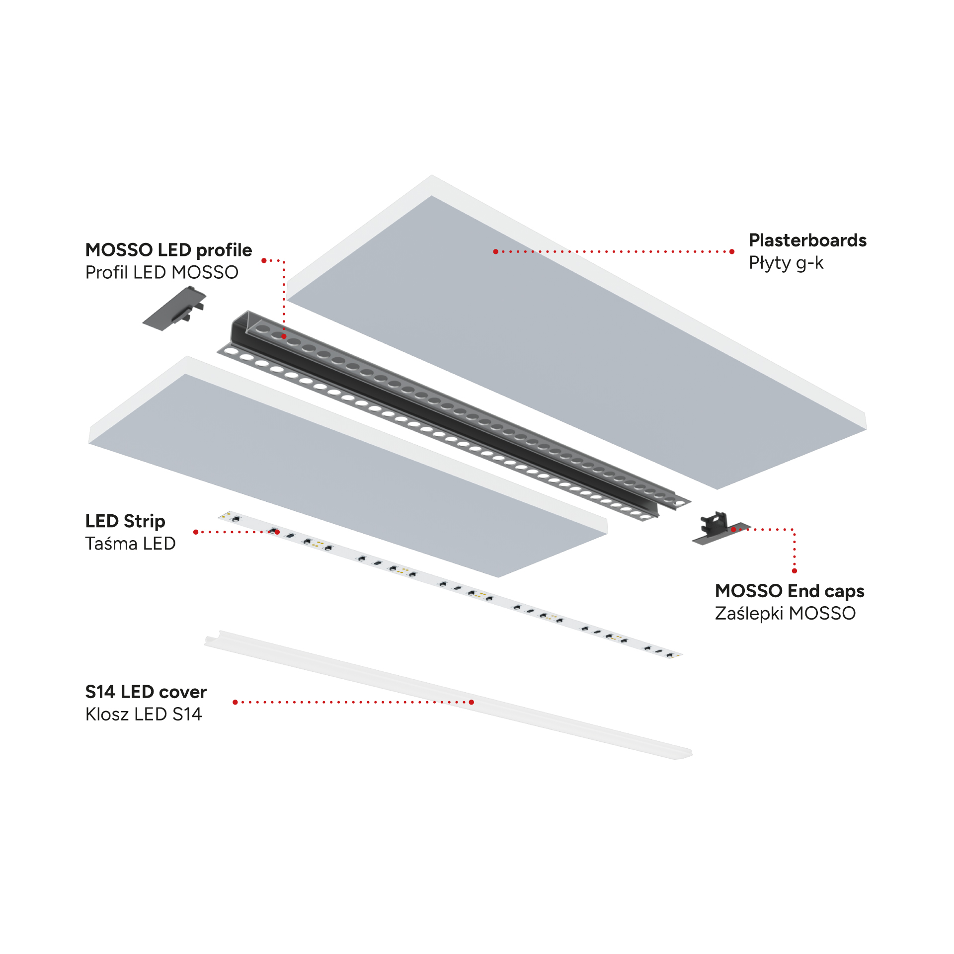 Zestaw zawiera: 1 x Profil LED MOSSO, 1 x Klosz LED S14, 4 x Zaślepka MOSSO
