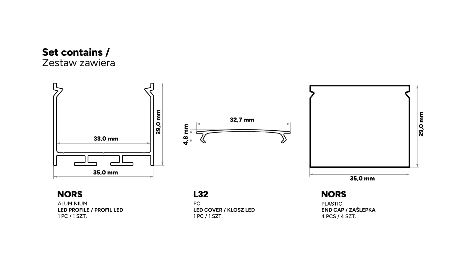 Zestaw zawiera: 1 x Profil LED NORS, 1 x Klosz LED L32, 4 x Zaślepka NORS