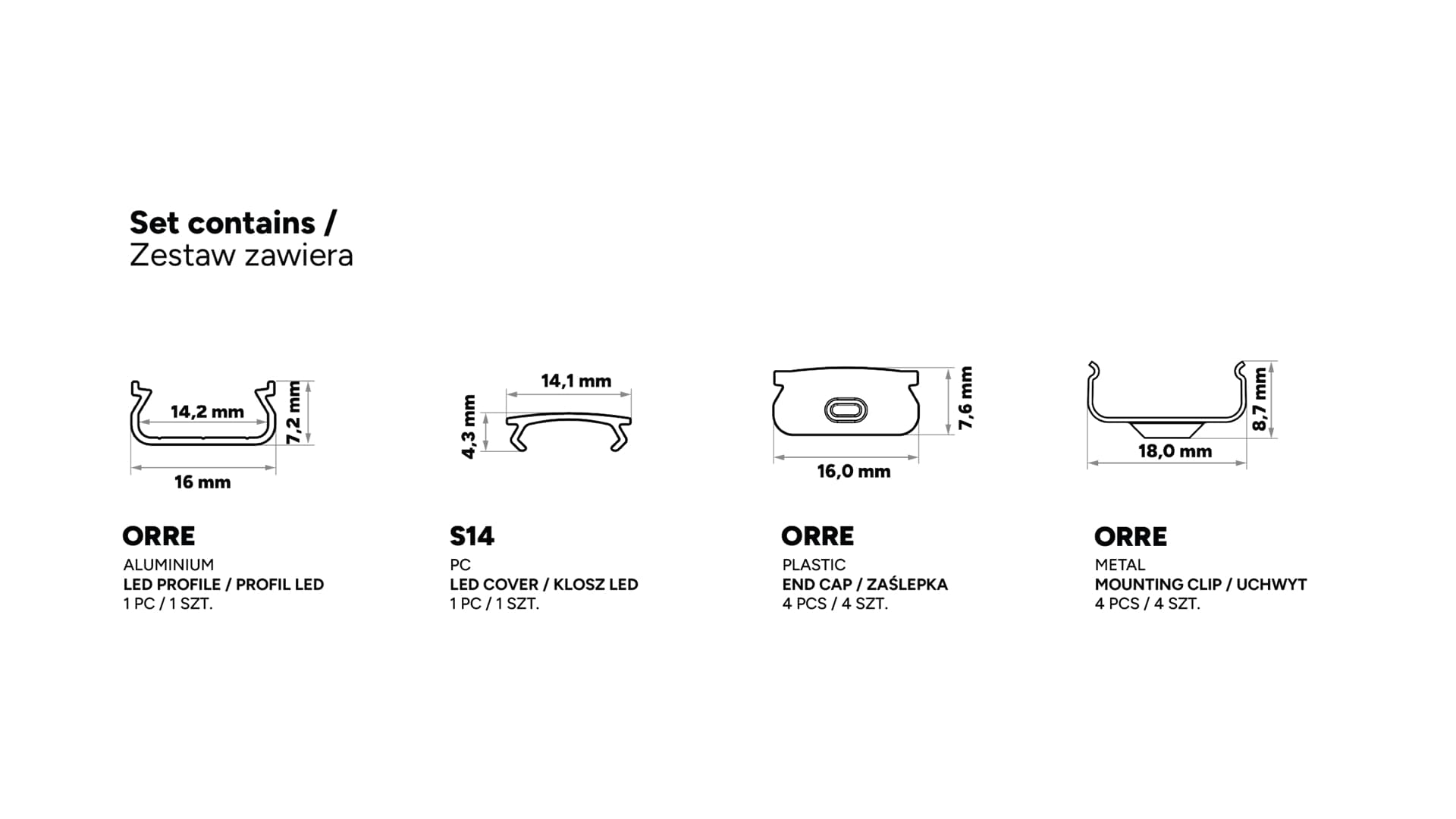 Zestaw zawiera: 1 x Profil LED ORRE, 1 x Klosz LED S14, 4 x Zaślepka ORRE, 4 x Uchwyt montażowy ORRE