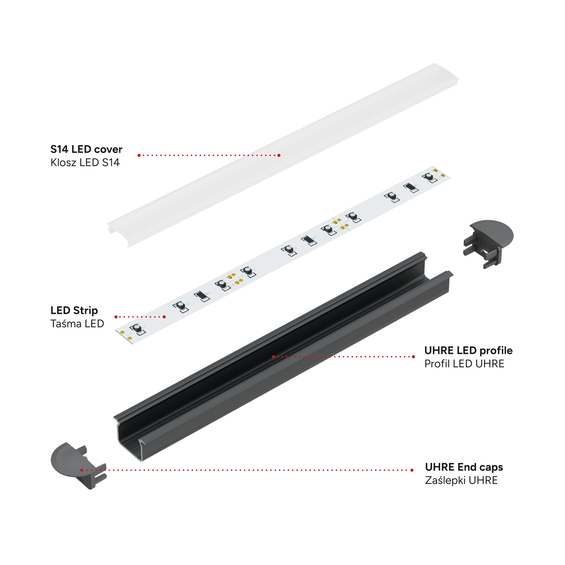 Zestaw zawiera: 1 x Profil LED UHRE, 1 x Klosz LED S14, 4 x Zaślepka UHRE